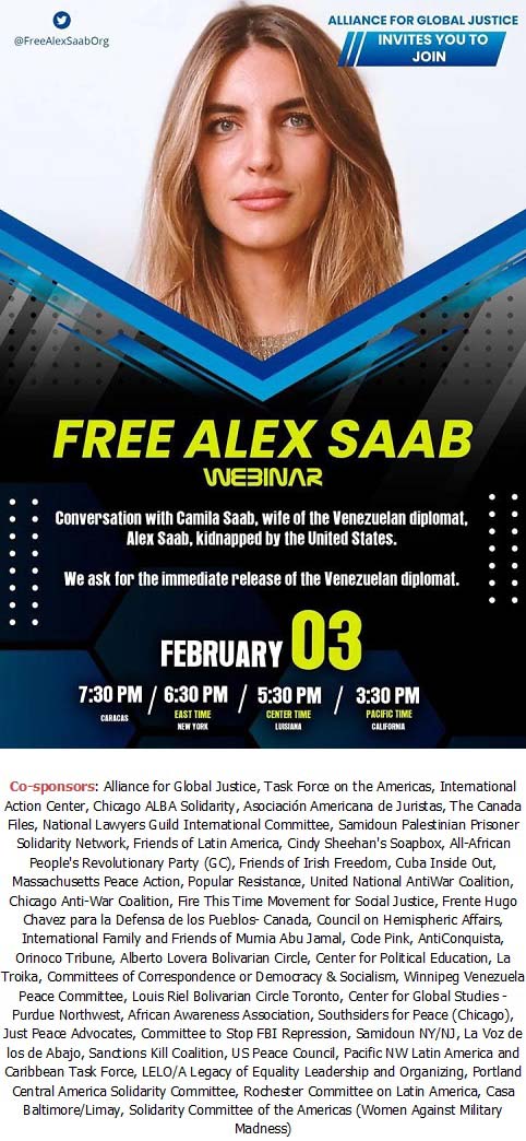 Alex Saab is a Venezuelan diplomat the US government has illegally seized and imprisoned for what the US considers “violation” of the illegal US economic warfare on Venezuela. He was in fact assisting Venezuela in legally working around the US blockade on his country by finding the means to import food, medicine, and materials for the Venezuelan oil industry. The US is seeking to coerce Alex Saab into disclosing the methods Venezuela uses to circumvent the US-Canadian-European sanctions with the goal of further tightening the economic blockade and suffering on the Venezuelan people. These sanctions are illegal according to the United Nations. His seizure by the US violates long-standing international law for one country to arrest and imprison a diplomat of another country. Alex Saab’s next trial date will be in Atlanta the week of April 4 – anniversary of the murder of Martin Luther King.