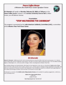 Speaker: Eri Avarado – writer, Buffalo Latino Village on peace, US bases, veterans, and Taino history.