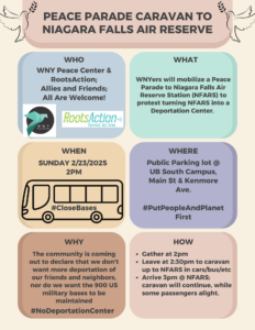 WNYers will mobilize a Peace Parade to Niagara Falls Air Reserve Station (NFARS) to take a stand on 2/23/25, which is the Global Day of Action to #CloseBases, and to protest Congresspersons Langworthy and Tenney’s request to Secretary of Defense Hegspeth to turn NFARS into a Deportation Center.