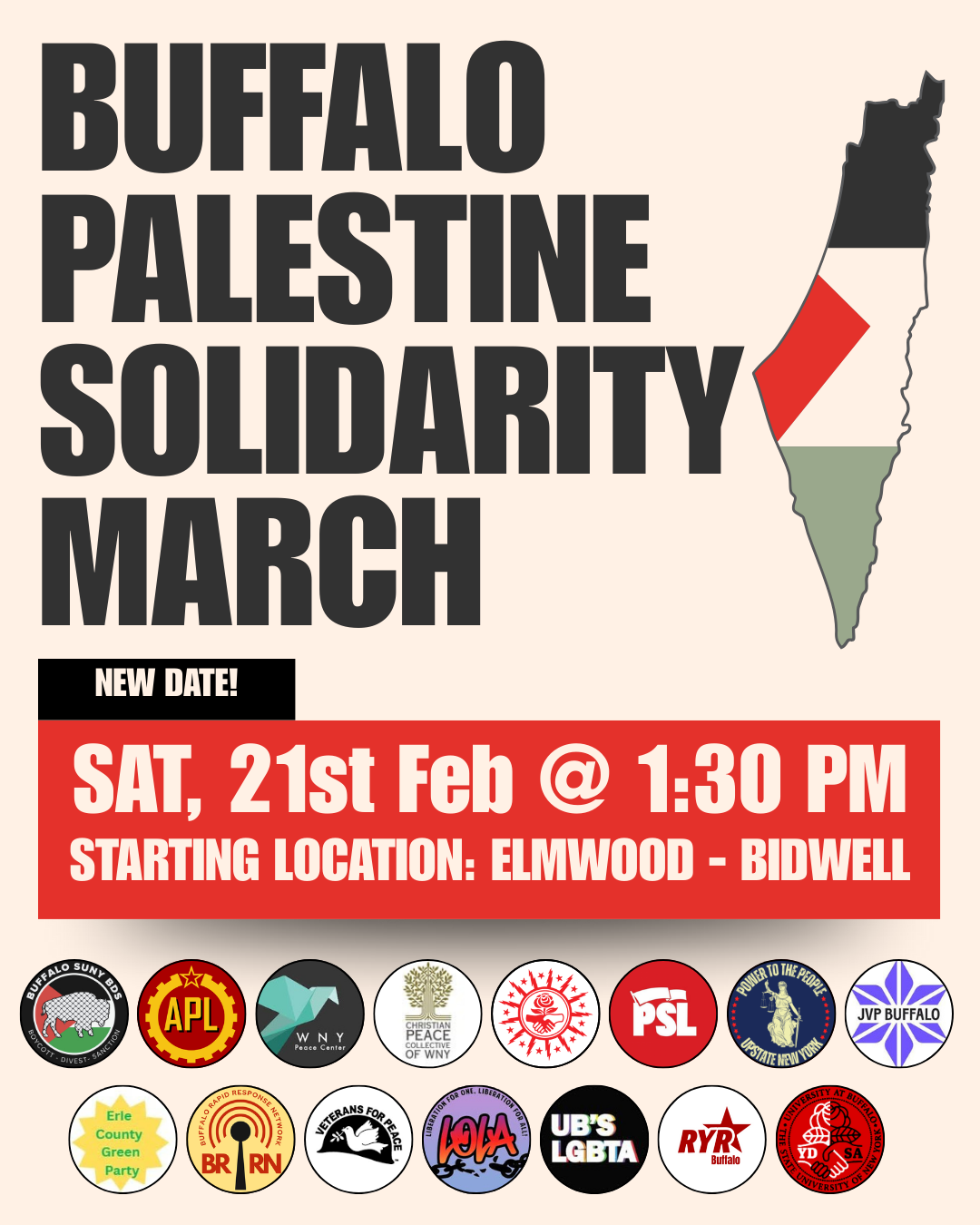 Join our coalition of allies as we march together from the Elmwood/Bidwell intersection to Buffalo State Campus, approximating the length of the Gaza Strip's sea coast, remembering the Palestinian people and cultural institutions lost to genocide. Saturday, February 21, 2026 Gather 1:30 at Bidwell Parkway and Elmwood Avenue March to Buffalo State Campus |